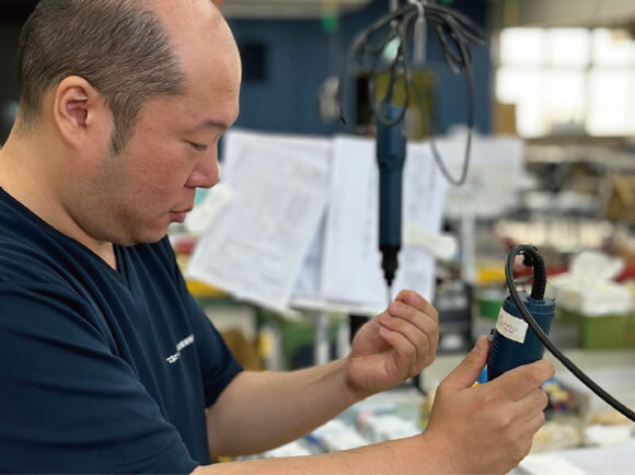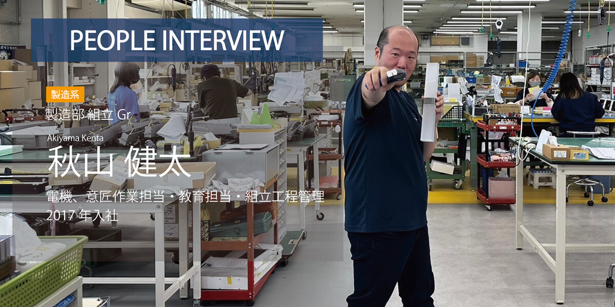 組立Grの電機作業、意匠作業、納期調整、外注対応などの工程担当をしています。 組立Grは社内でできた部品をひとつ一つすべて手作業で組立てます。製品が動作するように配線を組む「電機作業」と目に見える部品を組み立てる「意匠作業」がありますが、どちらの作業も状況に応じて担当しています。また、新人への教育を行っており、自分が今まで培ってきた技術を伝承することで作業者の技術力を育てています。工程担当の業務では、Grの状況を考慮した上で社内での納期調整を行い、効率良く製品が生産できるように作業に取り掛かる順番や時期を考え、Gr内に指示をしています。